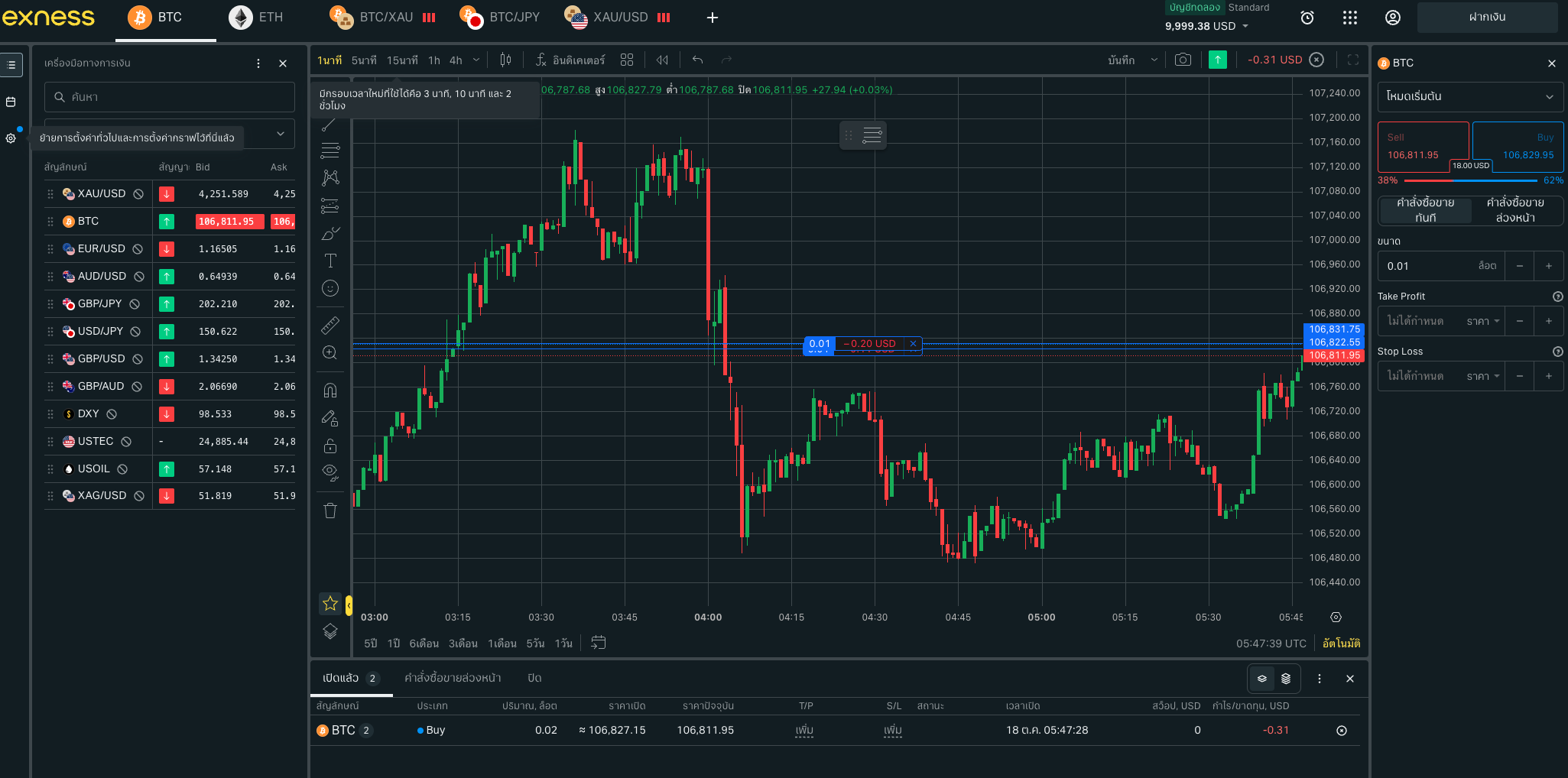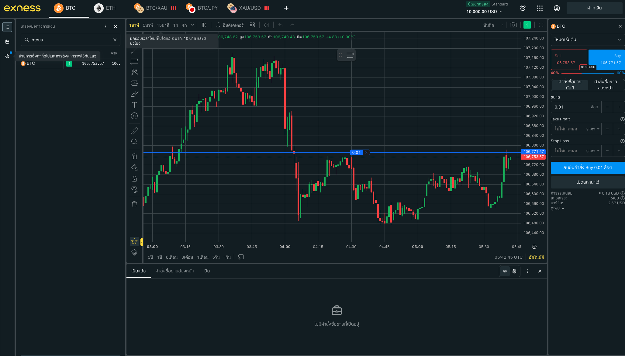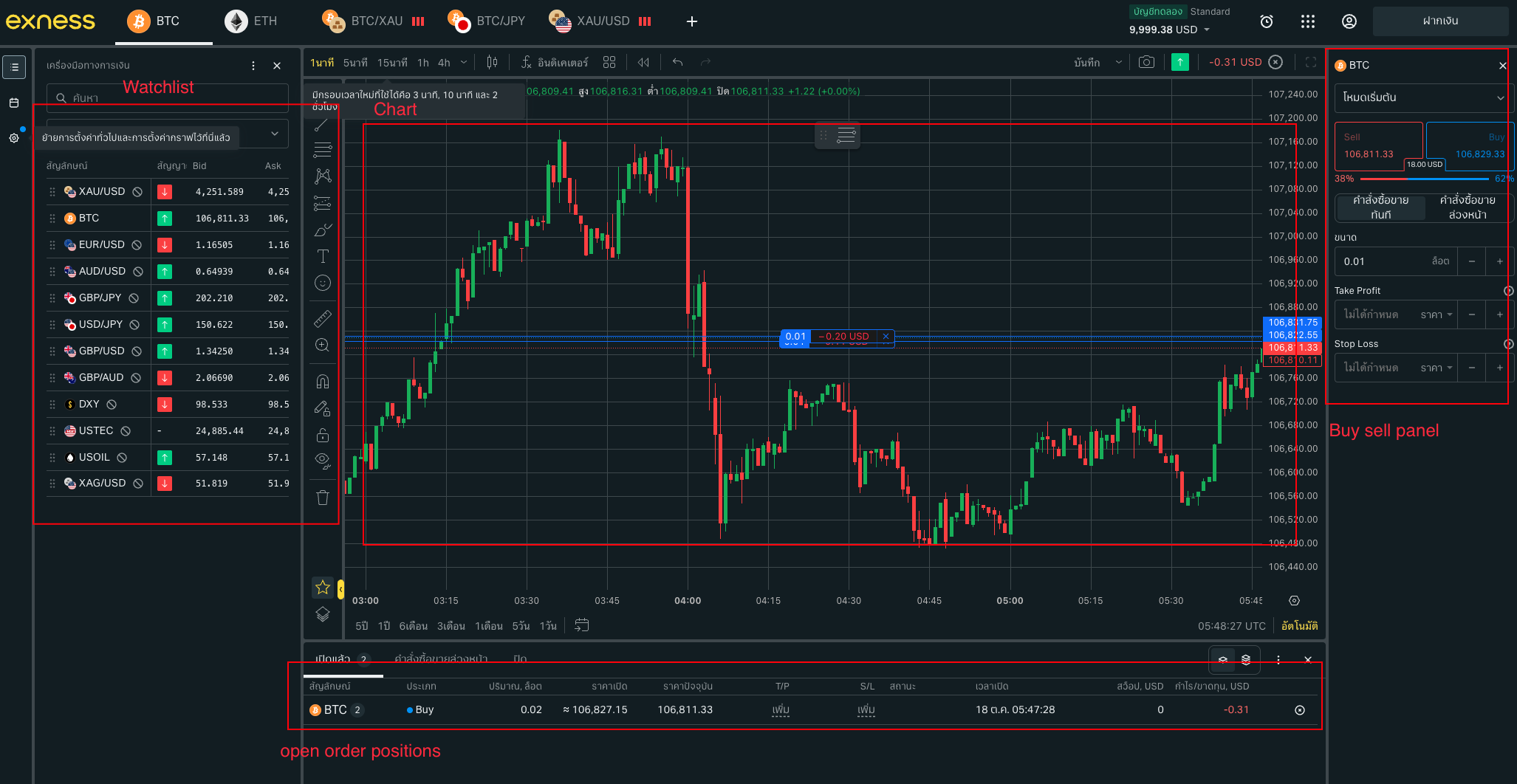 • กราฟราคา (Chart): ส่วนแสดงกราฟราคาที่ขับเคลื่อนโดย TradingView ซึ่งเป็นเครื่องมือชั้นนำ ช่วยให้คุณวิเคราะห์ตลาดได้ง่ายขึ้น