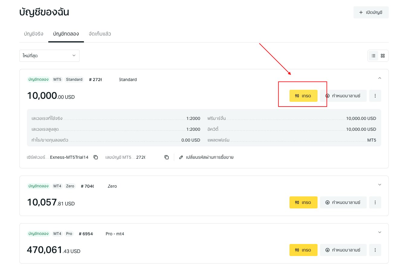 2. เลือกบัญชี MT5: ในหน้าบัญชีซื้อขายของคุณ ให้มองหาบัญชี MT5 ที่คุณต้องการใช้เทรด