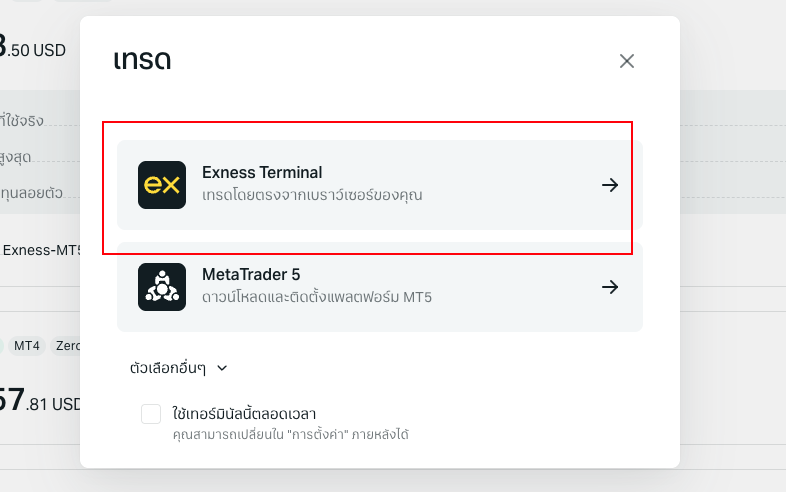 3. เปิด Terminal: คลิกที่ปุ่ม "เทรด" หรือ "ซื้อขาย" ที่อยู่ข้างบัญชี MT5 นั้น ระบบจะเปิด Exness Terminal ขึ้นมาในแท็บเบราว์เซอร์ใหม่