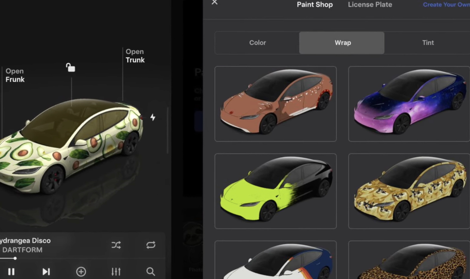 4. Personalization & เปลี่ยนลุกรถ: ใน Toybox > Colorizer (ตอนนี้ชื่อใหม่เป็น “Paint Shop”) — เจ้าของ Tesla สามารถเปลี่ยนลาย wrap, สีกรอบหน้าต่าง, แผ่นป้ายทะเบียนจำลอง หรือแม้แต่เพิ่มลายเองผ่าน USB ได้ — เหมาะกับคนที่อยากแต่งรถให้มีสไตล์ไม่ซ้ำใคร